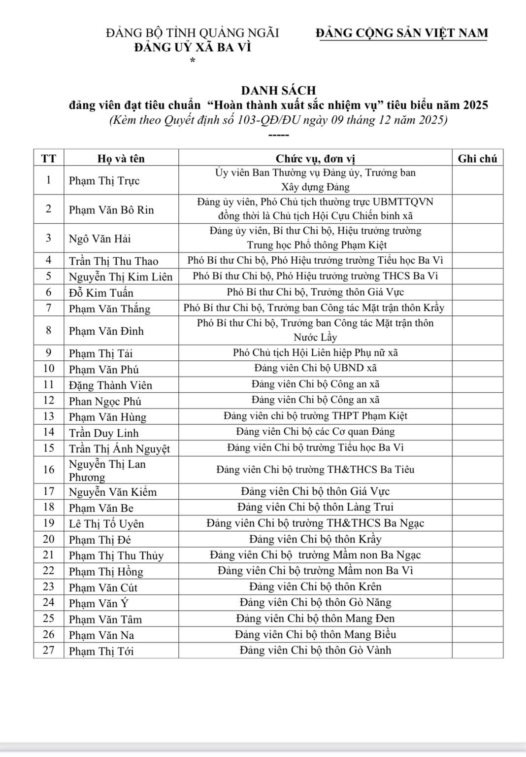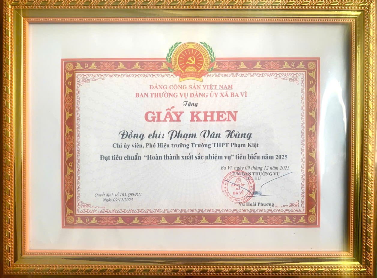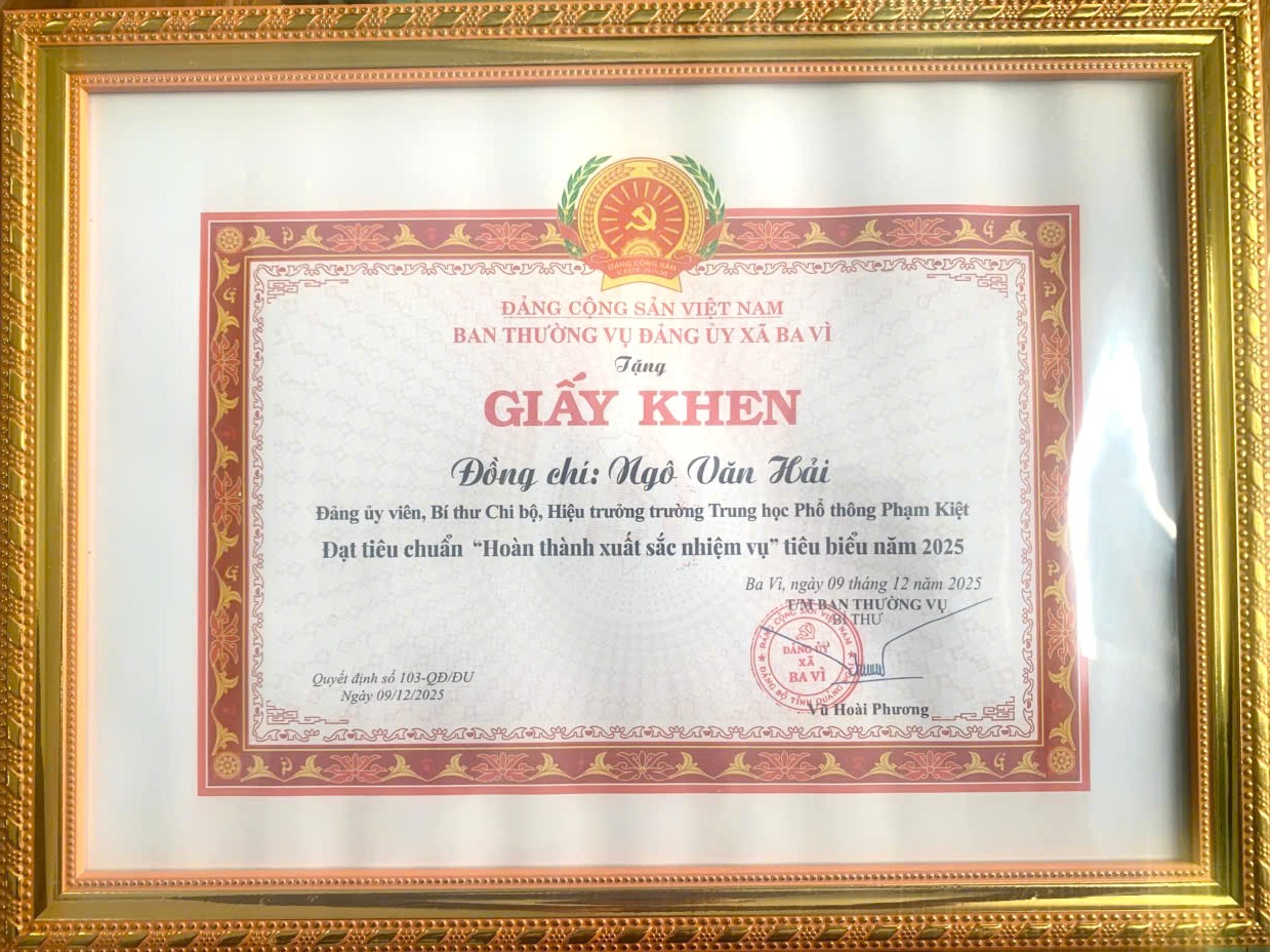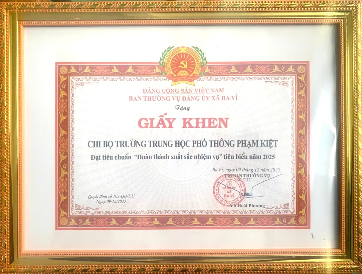 Ghi nhận những kết quả nổi bậc đó, tại Hội nghị tổng kết công tác xây dựng Đảng năm 2025, Ban Thường vụ Đảng ủy xã Ba Vì đã tặng Giấy khen cho Chi bộ Trường THPT Phạm Kiệt và cá nhân đồng chí Bí thư Ngô Văn Hải, đồng chí Chi ủy viên Phạm Văn Hùng đạt tiêu chuẩn “Hoàn thành xuất sắc nhiệm vụ” tiêu biểu năm 2025. Đây là sự đánh giá khách quan, thể hiện sự quan tâm, ghi nhận của Đảng bộ xã đối với những thành tích và đóng góp thiết thực, hiệu quả của tập thể chi bộ và các đồng chí cấp ủy trong công tác xây dựng Đảng và thực hiện nhiệm vụ chính trị của chi bộ, nhà trường.